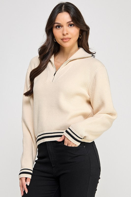 Half Zipper, Collard Pull Over Sweater, Banded Sleeves and Banded Waist.