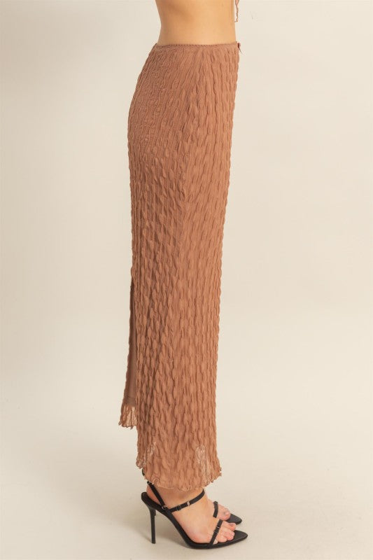FABRIC: Very stretchy and soft/comfortable. Fully lined. Slit in the back. Elastic waist.