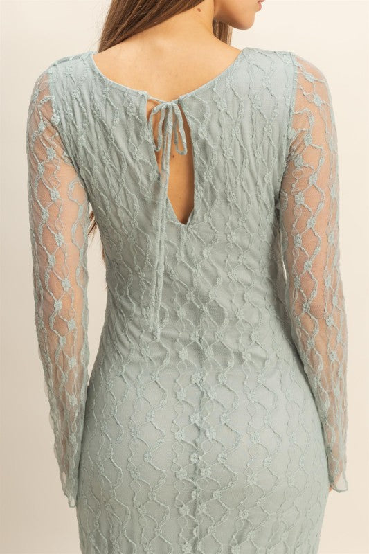 Bodice is lined, stretchy fabric, maxi length, keyhole opening in the back with tie, pull over dress, flared sleeves at wrists.